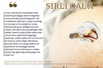 Sirli qalʼa Inson dunyoga kelibdiki, har kuni uni oʻrab turgan borliq, atrofidagi turfa xil mavjudotlarga yoʻliqadi. Atrofimizdagi barcha narsa ularning yaratuvchisi, yaʼni yoʻqdan bor qiluvchisi ularni shunday holatga keltirganiga ishora...
