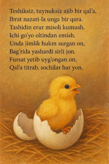 . Garchi uning ichida nafas olish uchun havo yetarli boʻlmaganiga qaramay, undan eshituvchi va koʻruvchi bir hayvon yorib chiqdi. Nahotki bu gʻaroyib holat uni yuzaga keltiruvchi qudratli bir zot borligiga dalolat qilmasa?! Axir bu ishning oʻz-oʻzidan boʻlishi aql qabul qila olmaydigan bir holat-ku!”.